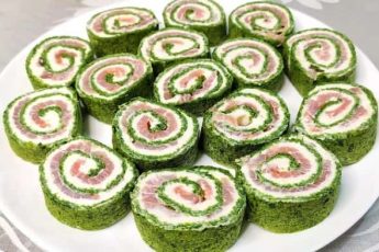 Загортаємо тісто рулетом, не доходячи від краю, розрізаємо тісто на половину і загортаємо спіраллю.