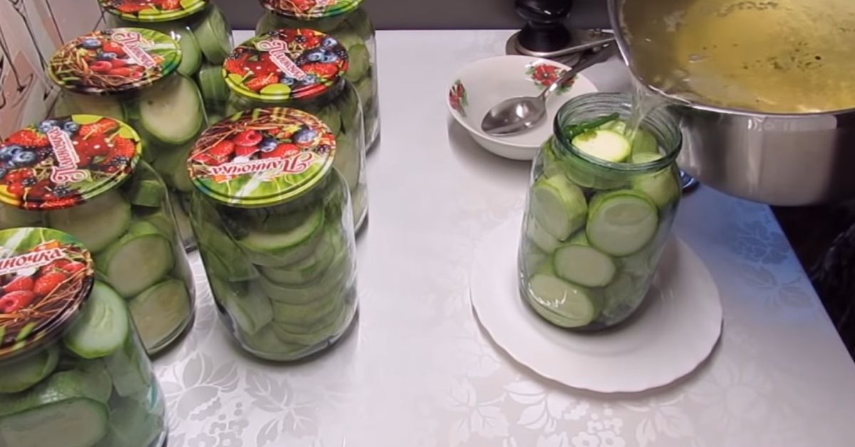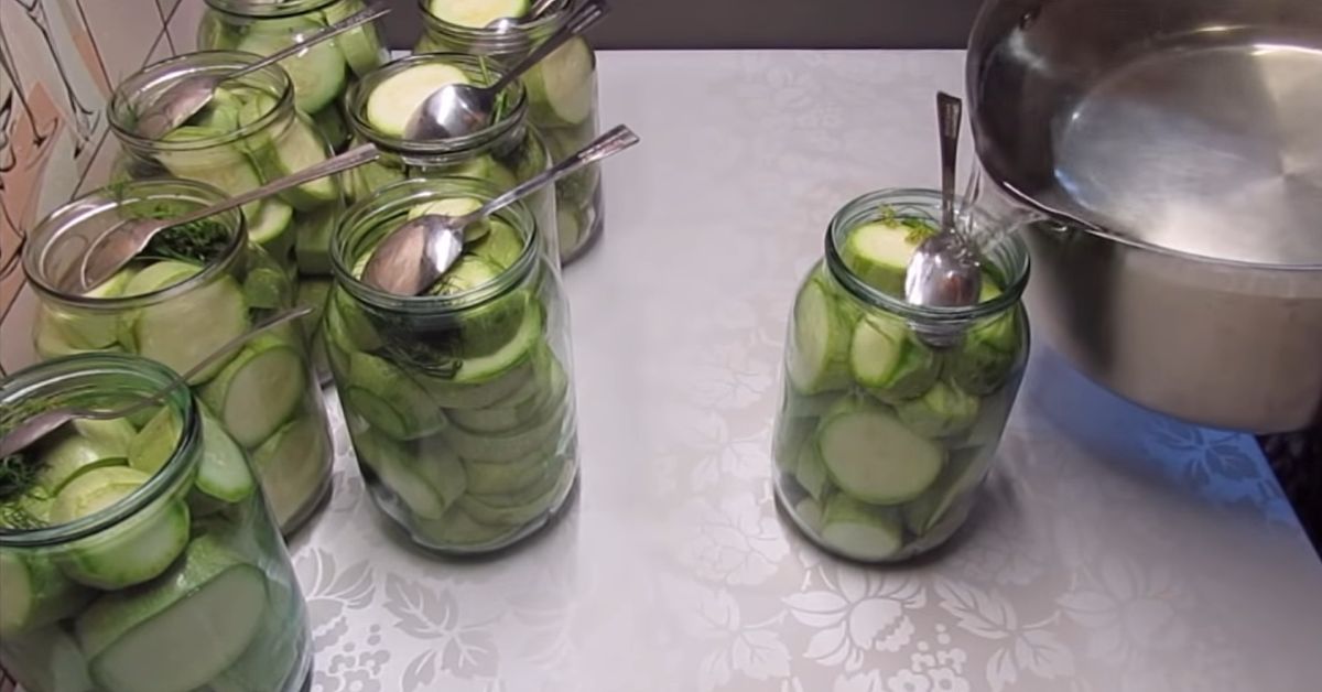 Па ложці залийте крутий окріп в кожну банку. Так вона точно не лопне. Кришки заздалегідь прокип’ятіть. Накрийте ними кабачки, залиште заготовки на 15 хвилин.