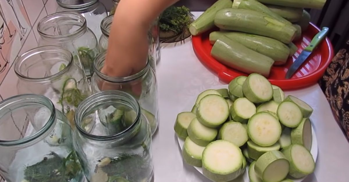 Кабачки гарненько промийте, відріжте їм кінчики з обох сторін. Наріжте овочі кружечками середньої товщини ( 1,5 – 2 см ). Щільно утрамбуйте кабачки в банки.