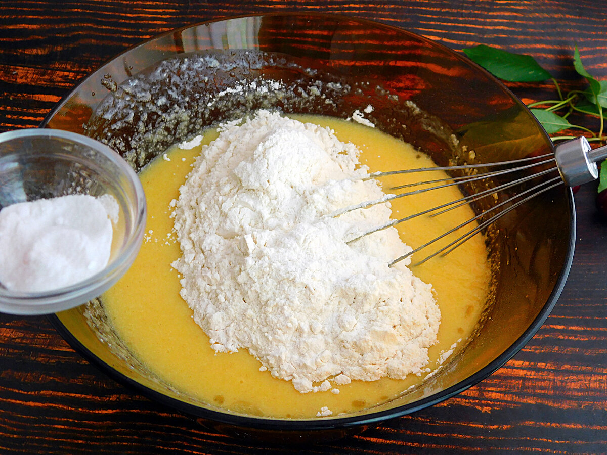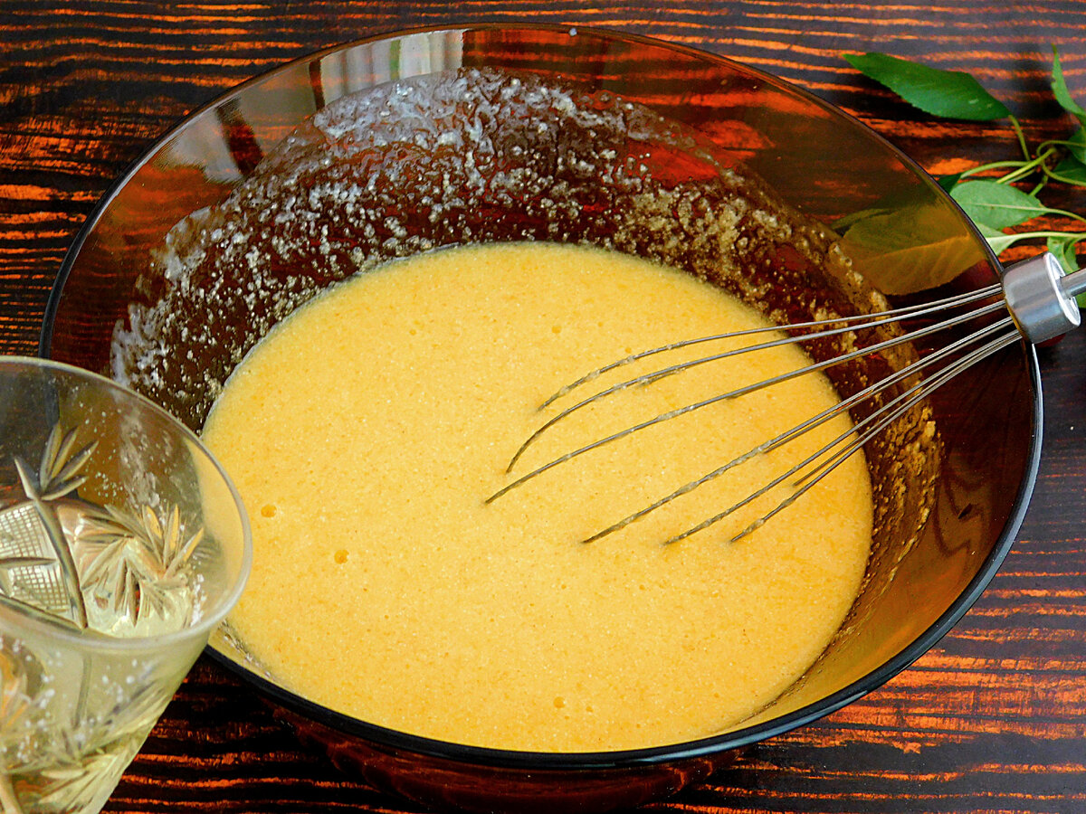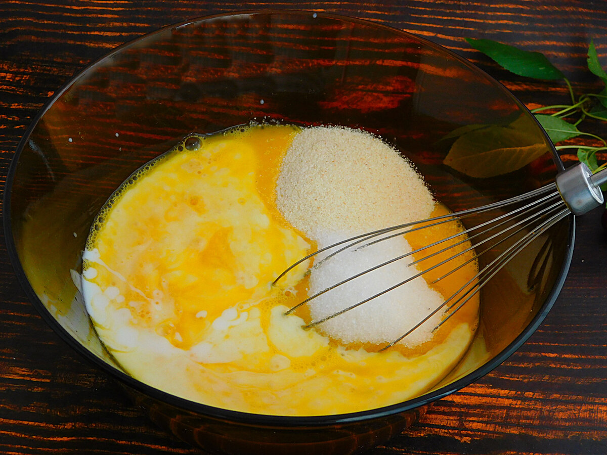Збовтати вінчиком до об’єднання білка та жовтка. Всипати манку, цукор, влити кефір.