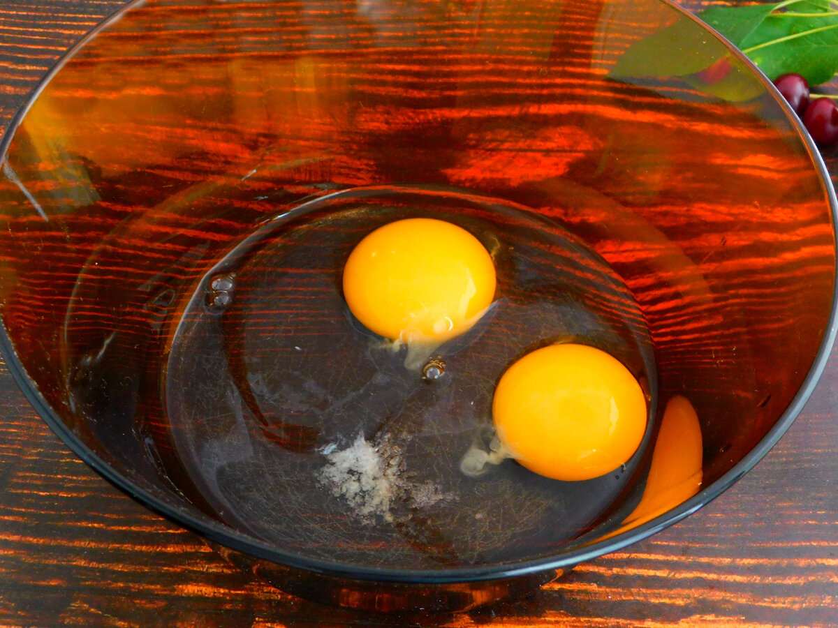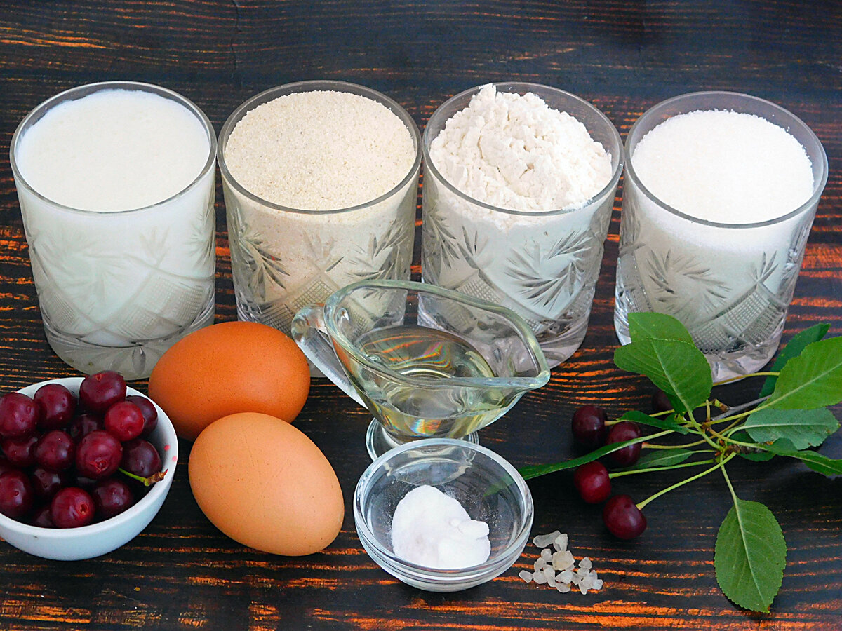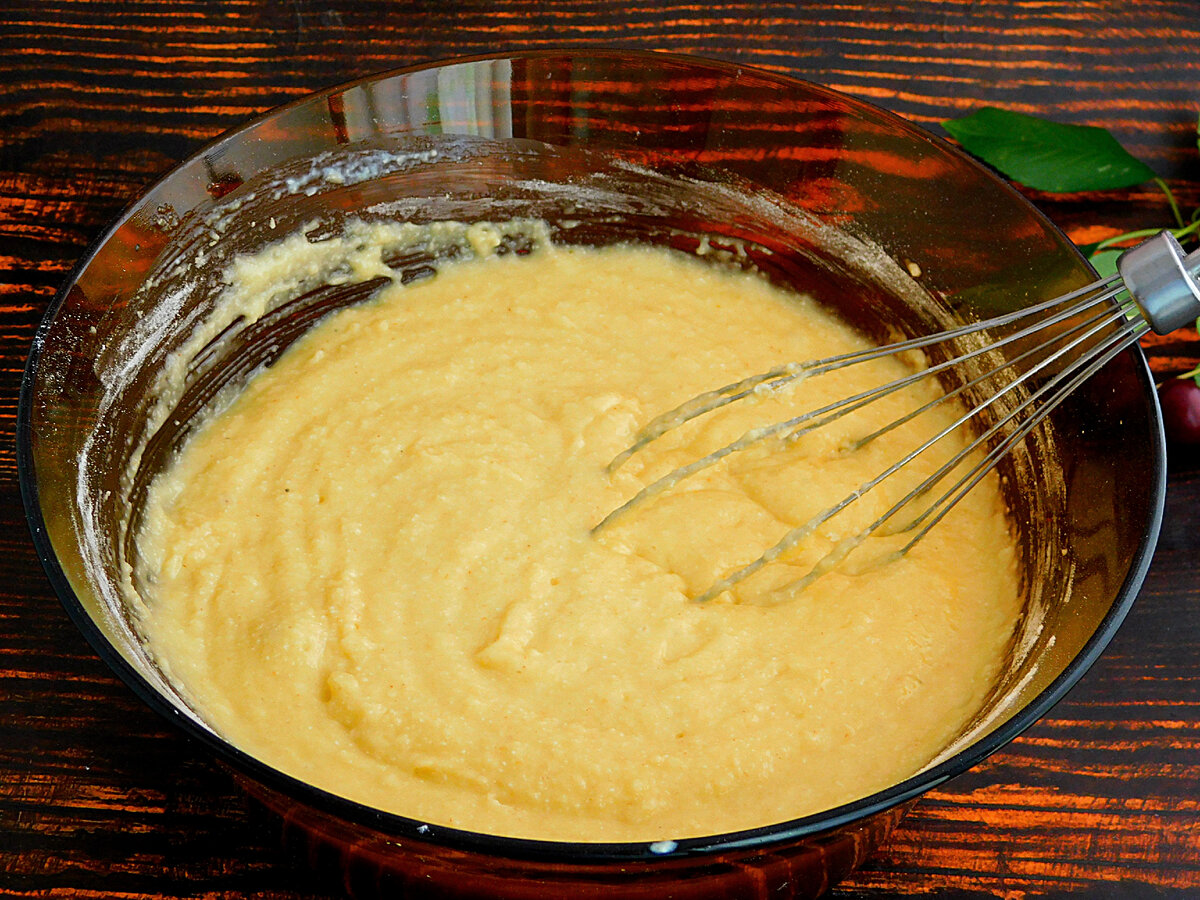 Перемішати та залишити на 15 хвилин. Це потрібно для того, щоб манка набухла. За цей час вишню помити, звільнити від кісточок, якщо заморожена, то розморожувати не потрібно.