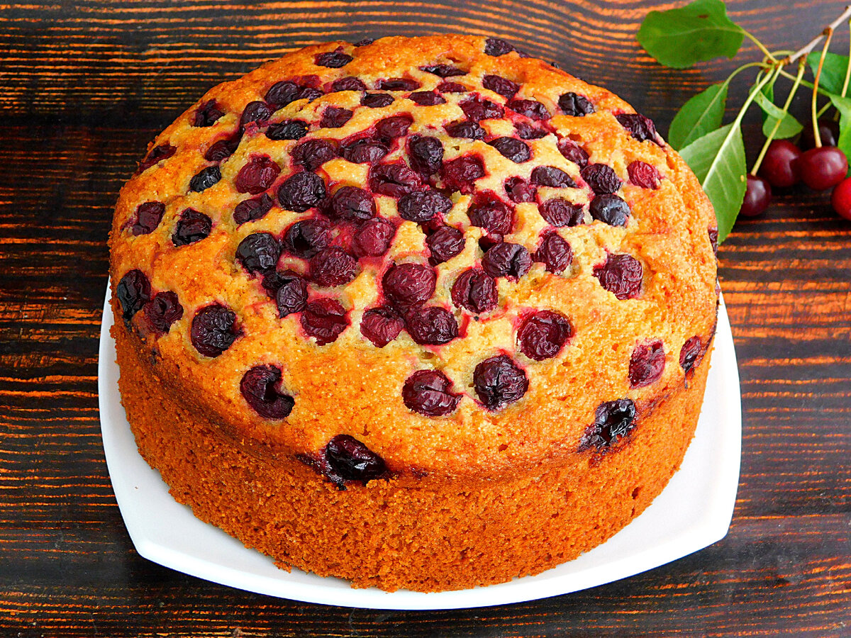 Форму діаметром 20 см змастити олією, вилити тісто. Зверху розподілити вишні.