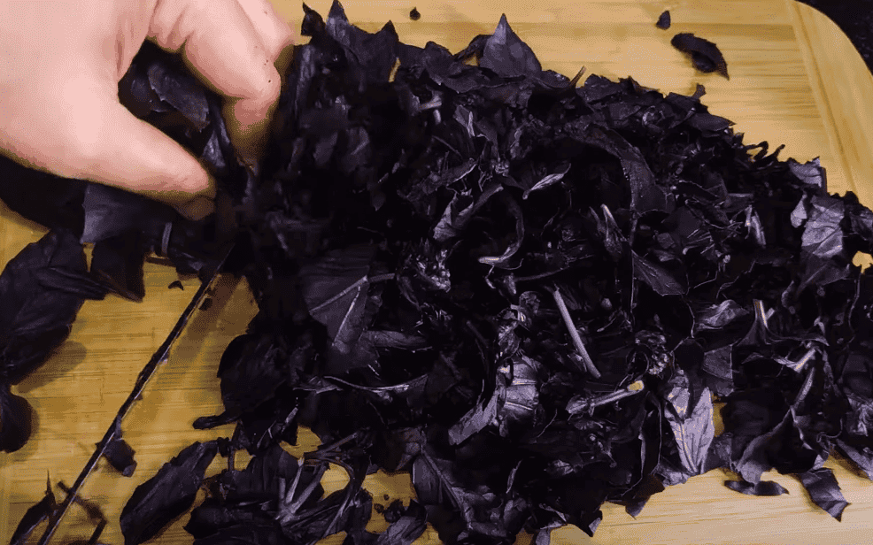 4. Беремо два великі пучки базиліка, товсті стебла видаляємо. Вага очищеного листя базиліка 150 гр. Подрібнюємо дрібно листя базиліка. Хороший пучок петрушки також дрібно подрібнюємо.