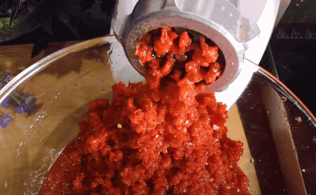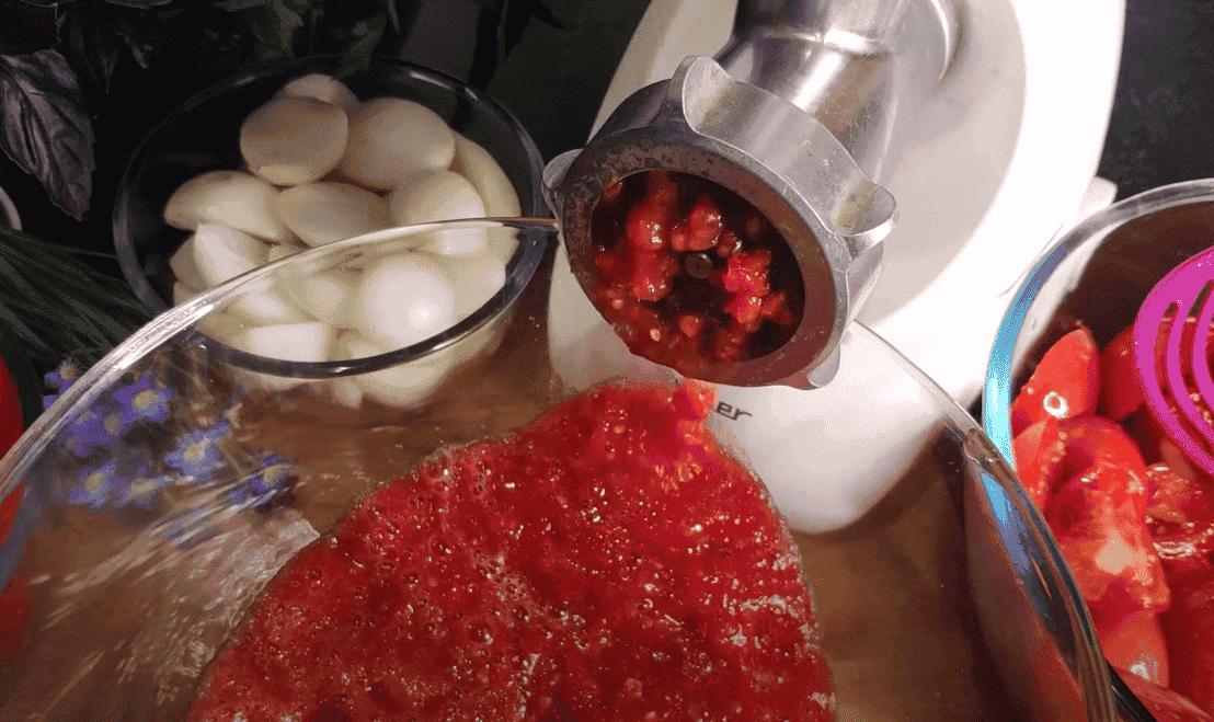 2. Помідори пропускаємо через м’ясорубку та перекладаємо їх у широку каструлю на плиті.