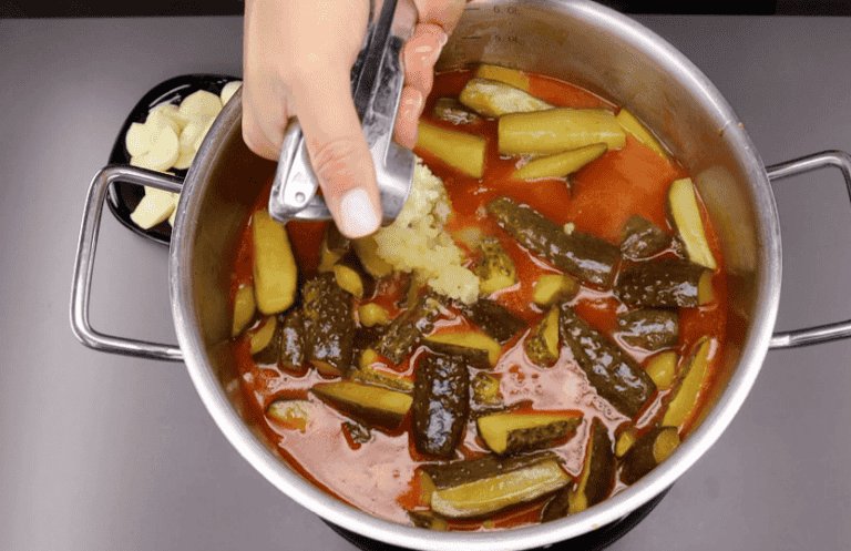 Ну що ж, 25 хвилин минуло, тепер я об’єдную огірки з двох каструль, перемішую і додаю часник, пропущений через прес.