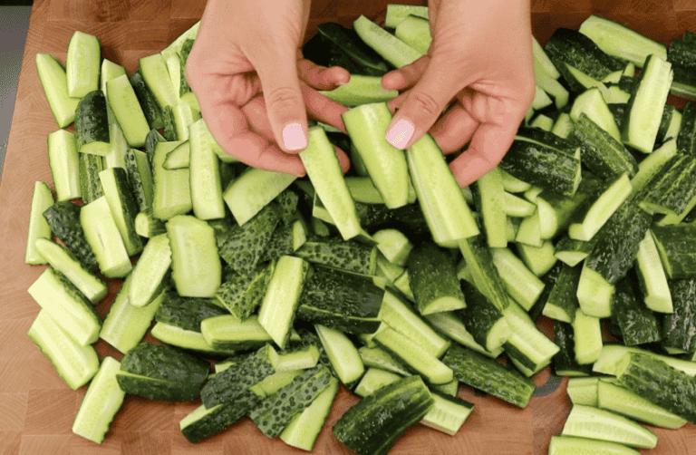 Відрізаємо у них хвостики та розрізаємо на 4 частини. Якщо огірки довгі та великі, то перерізаємо ще навпіл. Так буде зручніше їх класти у банку, а потім їсти.