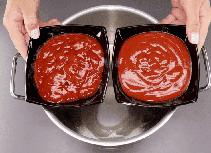 Тепер в каструлю виливаємо воду і 9% оцет, склянку олії, а також висипаємо 180 г цукру і 1,5 ст. л. солі, ще кладемо по 250 г 2 видів кетчупу – томатний та кетчуп чилі. Перемішуємо до однорідності та маринад для огірків готовий. Поки відставимо його убік і наріжемо огірки.