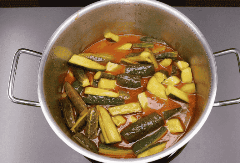 Ставимо каструлі на плиту, включаємо максимальне нагрівання, щоб маринад швидше закипів, добре перемішуємо, накриваємо кришкою і проварюємо огірки на слабкому вогні 25 хвилин.