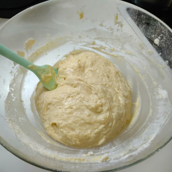 Додаємо опару і борошно, що просіюємо. Замішуємо тісто кулінарною лопаткою – воно рідкіше, ніж звичайне здобне тісто.