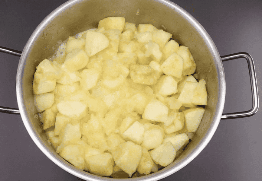 Беремо 3 кг яблук будь-якого сорту. Миємо їх, очищаємо, видаляємо серцевину і нарізаємо на шматочки. Пересипаємо у велику каструлю.