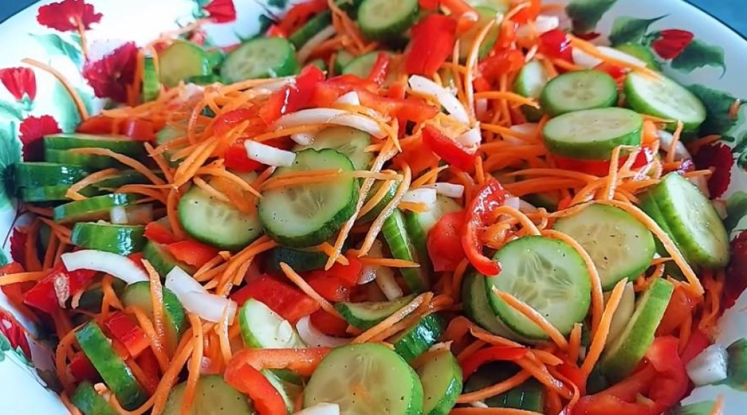 Яскравий салат з огірком, солодким перцем і морквою по-корейськи – літо в банці! Закрийте трохи сонячних променів на зиму. З цим рецептом у вас завжди буде можливість поласувати соковитою літньою закускою. Достатньо лише уявити собі хрускіт овочів та легкий часниковий аромат – і можна приступати до приготування!