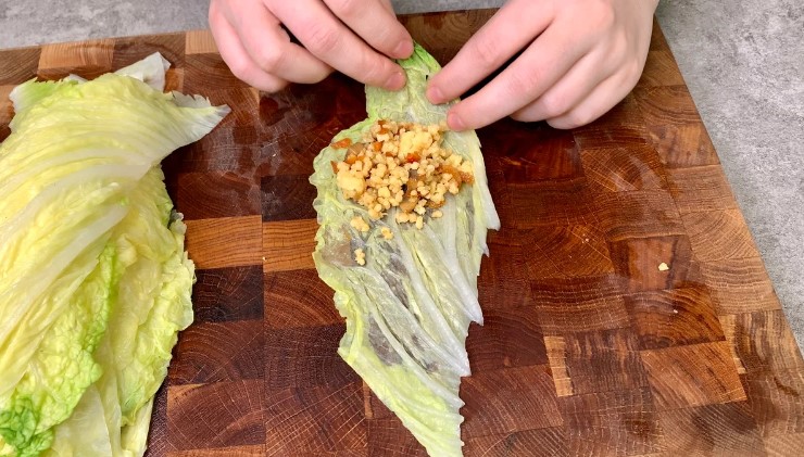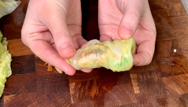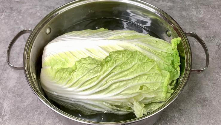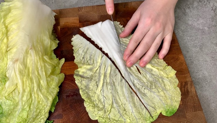 4. Качан пекінської капусти бланшуємо в окропі 2-3 хвилини, потім відділяємо м’які листя і вирізаємо білу жорстку частину.