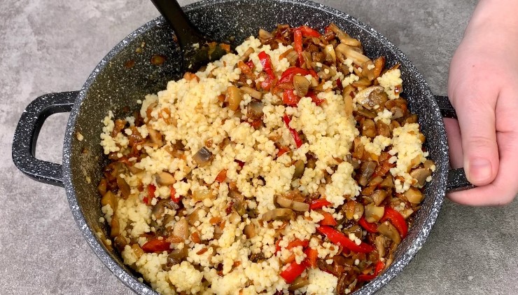 5. З’єднуємо охололу пшонку з засмажкою і ретельно перемішуємо. Начинку пробуємо і, при необхідності, досолюємо за смаком.