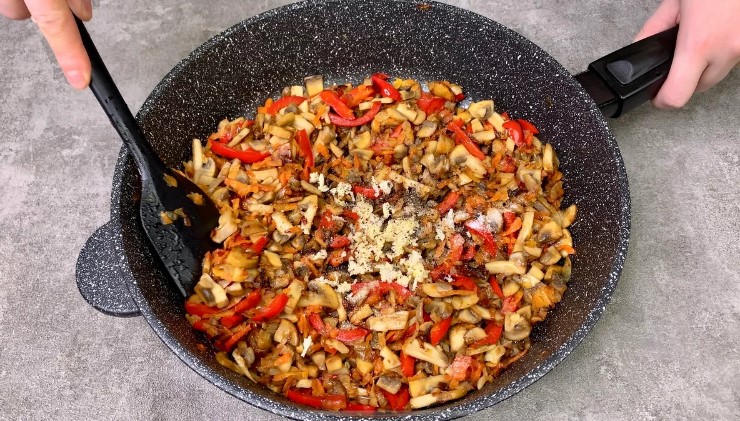 3. Далі відправляємо в сковороду печериці і готуємо до повного випарювання рідини. За хвилину до готовності натираємо пару зубчиків часнику, солимо, перчимо, перемішуємо і знімаємо з вогню.