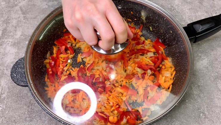 2. У сковороді з олією обсмажуємо до золотистості цибулю кубиком, додаємо терту моркву, смажимо ще пару хвилин, потім закладаємо солодкий перець соломкою, накриваємо кришкою і тушкуємо все ще 3-4 хвилини.