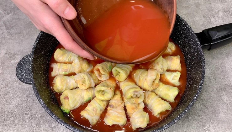 7. На дно каструлі або сковороди укладаємо кілька капустяних листя, викладаємо підготовлені голубці, заливаємо сумішшю з томатної пасти, води, солі і цукру.