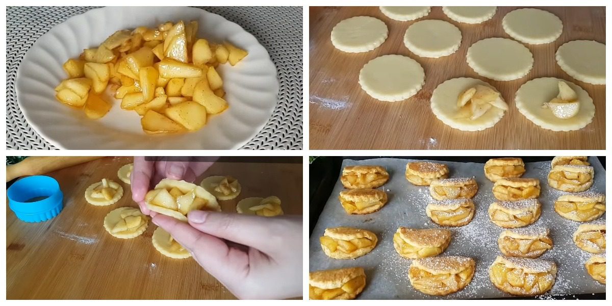У сковороді розтопіть масло, додайте цукор, яблука та корицю. Обсмажте до легкої карамелізації, потім охолодіть. - Тісто.
