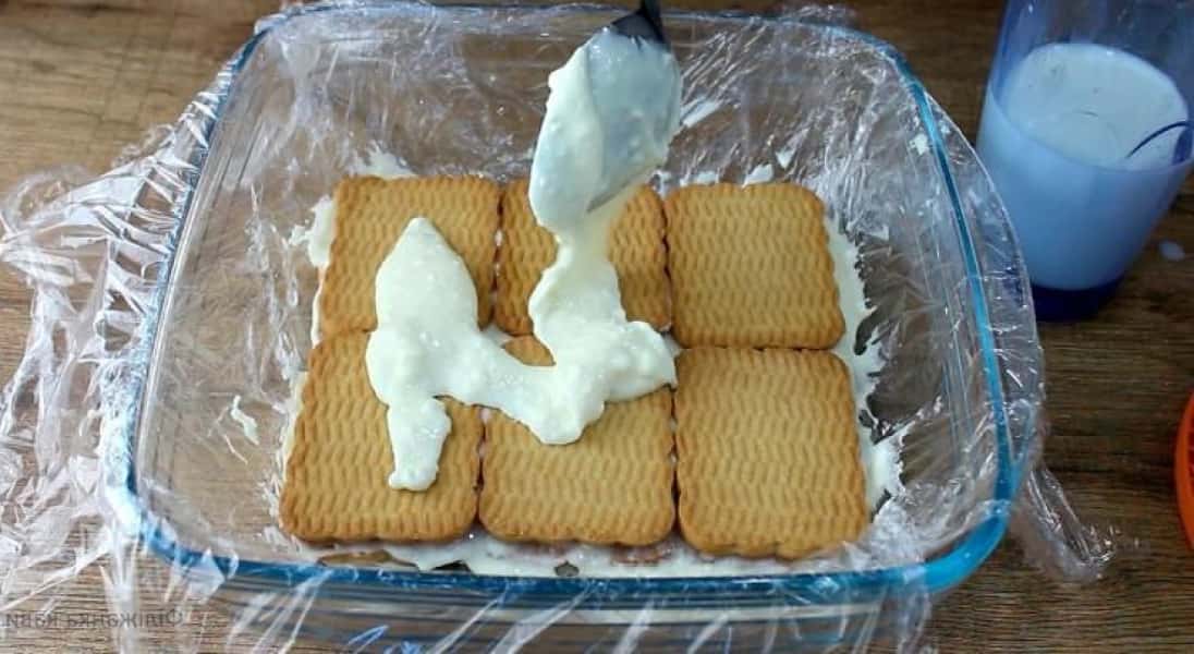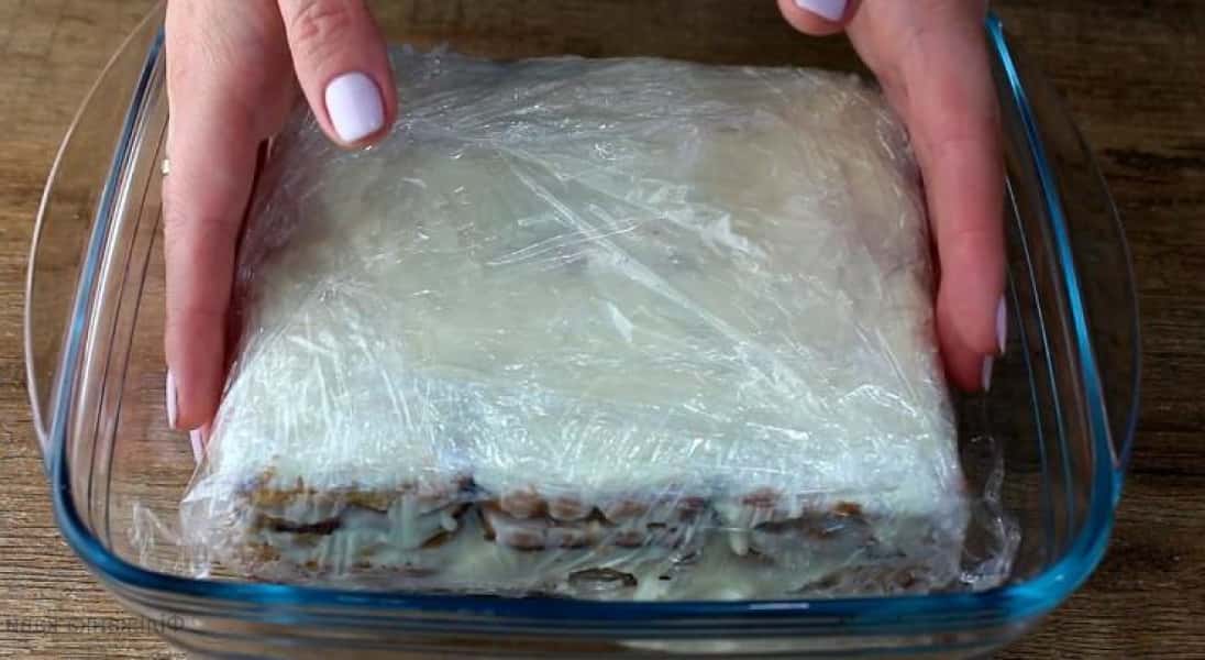 Усього у мене вийшло 5 шарів печива, але можна зробити 3 або 4 шари, залежно від розміру вашої форми. Зверху торт теж змащуємо кремом, накриваємо плівкою та забираємо в холодильник.