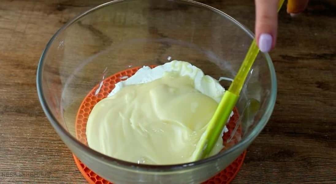 Приготуємо крем. Беремо пачку сиру, вершковий сир. Додаємо сюди пів банки згущеного молока і все перемішуємо.