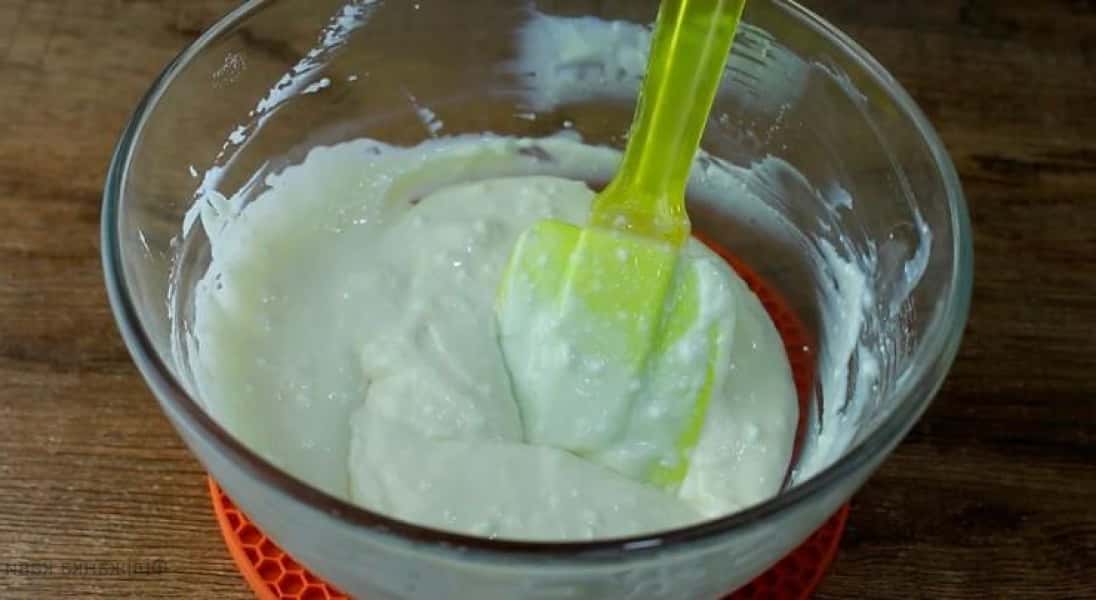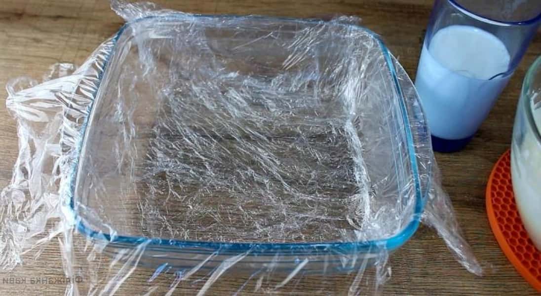 Беремо зручну форму та застеляємо плівкою хрест на хрест, якщо плануєте торт діставати із форми. Але можна цього не робити, а розрізати його потім прямо у формі.