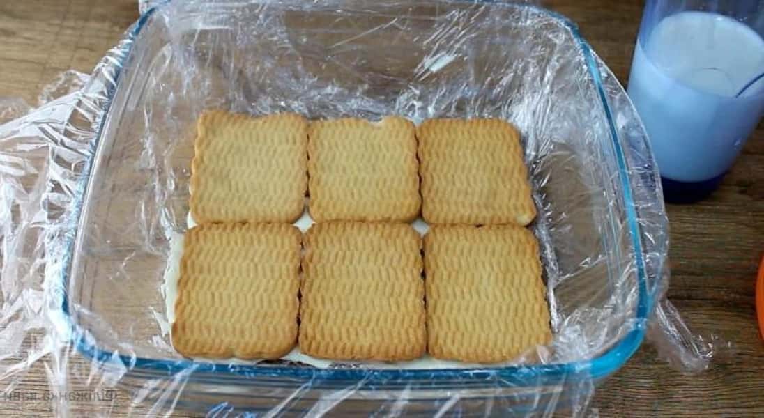 Змащуємо дно тонким шаром крему, опускаємо печиво в молоко та викладаємо у форму. У мене вмістилося 6 штук.
