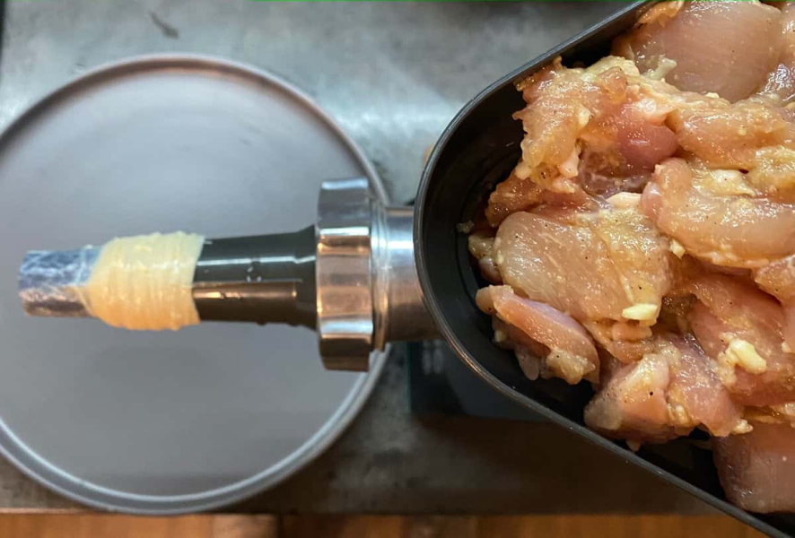 Натуральну оболонку промила і насадила на спеціальну насадку, яка додається до м’ясорубки. Набила шматочками курячого м’яса.