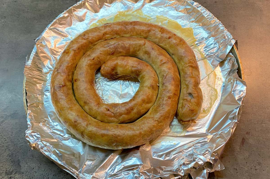 Переклала ковбасу на деко і зробила кілька проколів голкою. Це потрібно, щоб ковбаса не лопнула в процесі запікання. Накрила фольгою і поставила в холодну духовку. Встановила нагрів 150 градусів і запікала 1 годину.