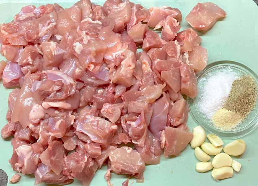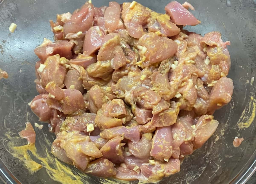 У мене були курячі стегенця без кісток і шкіри. Нарізала на шматочки, не дуже дрібні. Виклала в миску, додала гірчицю, сіль, перець, сушений часник і свіжий часник нарізаний на маленькі шматочки. Гарненько перемішала.