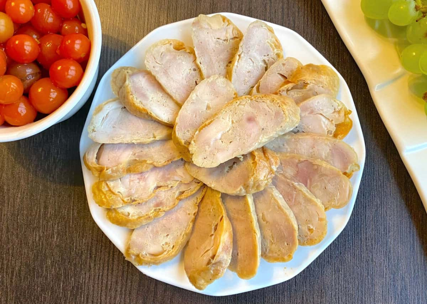 Остудила ковбасу в духовці, потім обернула плівкою і прибрала в холодильник мінімум на 4 години. Потім нарізала на скибочки. Можна їсти в гарячому вигляді, наприклад з картоплею 👍 або на бутерброди – ідеально.