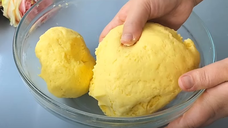 Просіюємо борошно і розпушувач в миску, додаємо м’яке вершкове масло і замішуємо не липке еластичне тісто. Висипаємо в тісто 100 г цукру, додаємо жовтки від 3-х яєць і сметану, продовжуємо заміс.