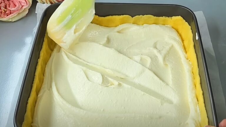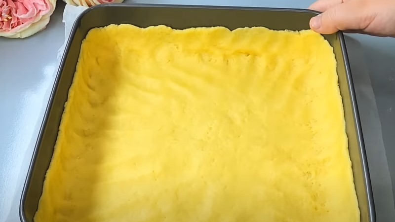У форму, застелену пергаментом, викладаємо тісто з холодильника, розподіляємо по всій поверхні.