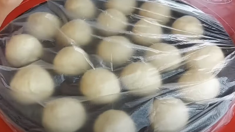 Далі обминаємо тісто і ділимо на невеликі частини, формуємо колобки. Змащуємо колобки сумішшю яйця та молока, накриваємо харчовою плівкою і залишаємо на деку на 20 хвилин.