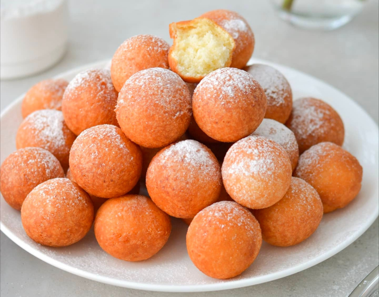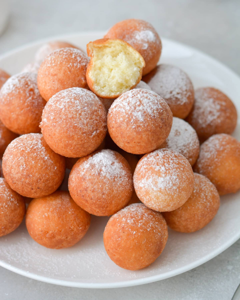 Пончики збільшуються у розмірах і стають рівними та красивими. Готові пончики викласти на паперову серветку, посипати цукровою пудрою.