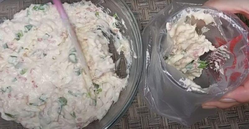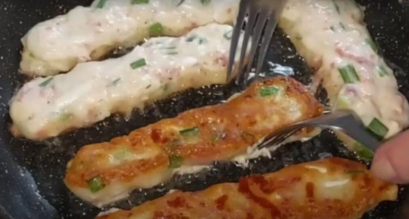 Змішуємо всі інгредієнти в тісті, викладаємо масу в кондитерський мішок. У сковороді розігріваємо олію, за допомогою кондитерського мішка видавлюємо смужки тіста на поверхню.