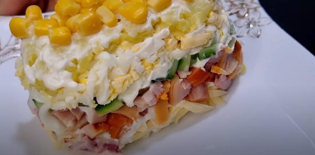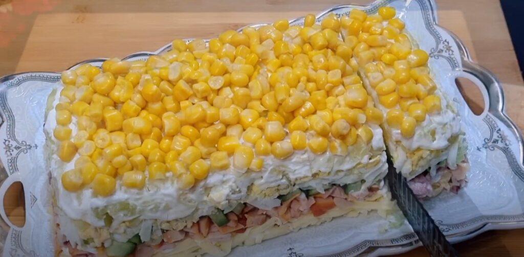 Беремо плоску тарілку та перевертаємо салат на неї. Страва має залишитися на тарілці цілою. На верх цієї конструкції викладаємо шар кукурудзи.