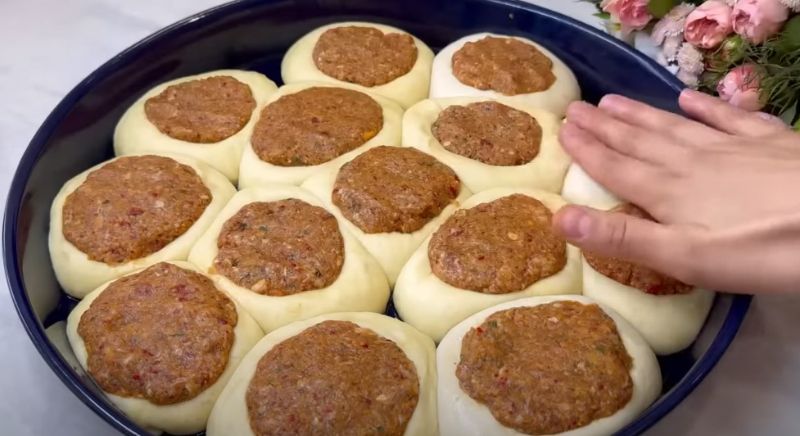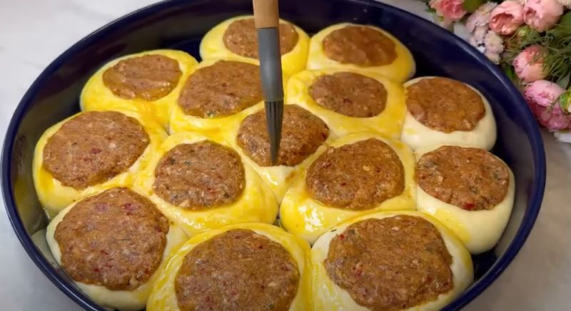 Залишаємо колобки з тіста у формі на 15 хвилин. Далі робимо у кожному колобку з тіста заглиблення пальцями. Кладемо колобки з фаршу в поглиблення, трохи притискаємо.