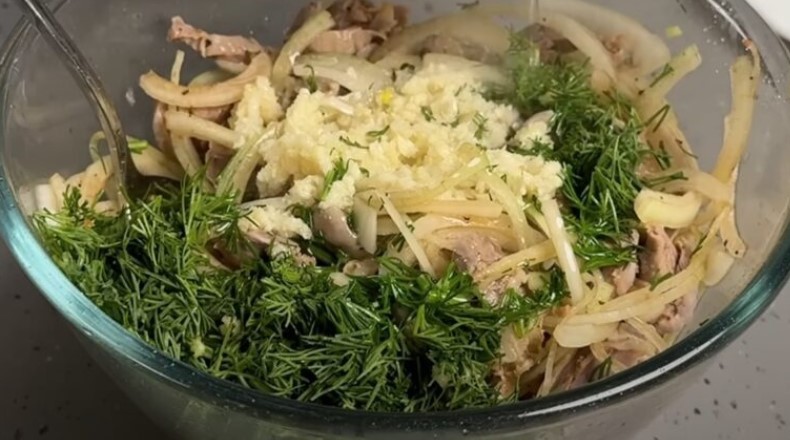Викладаємо до шлунків цибулю, часник, заливаємо все соєвим соусом. Посипаємо суміш подрібненим кропом.