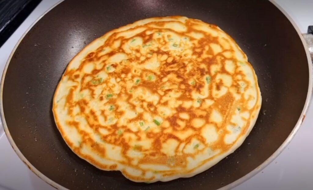 Смажимо коржик на середньому вогні під кришкою з двох сторін, доводимо до золотистого кольору.