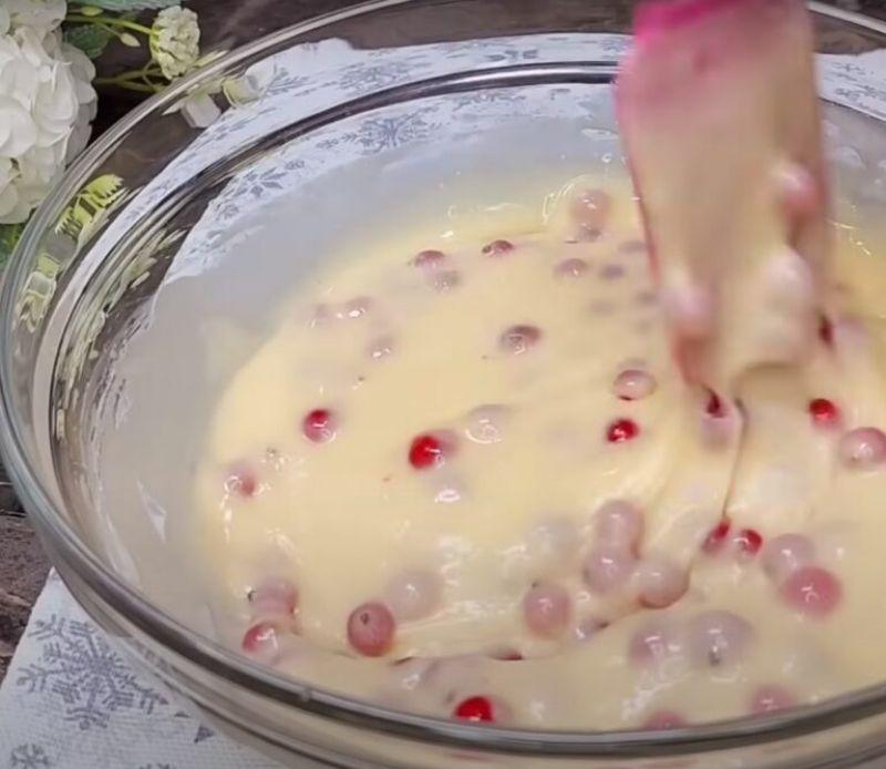 Висипаємо в суміш борошно з ваніліном та розпушувачем, замішуємо рідке тісто. У тісто викладаємо ягоди, перемішуємо.