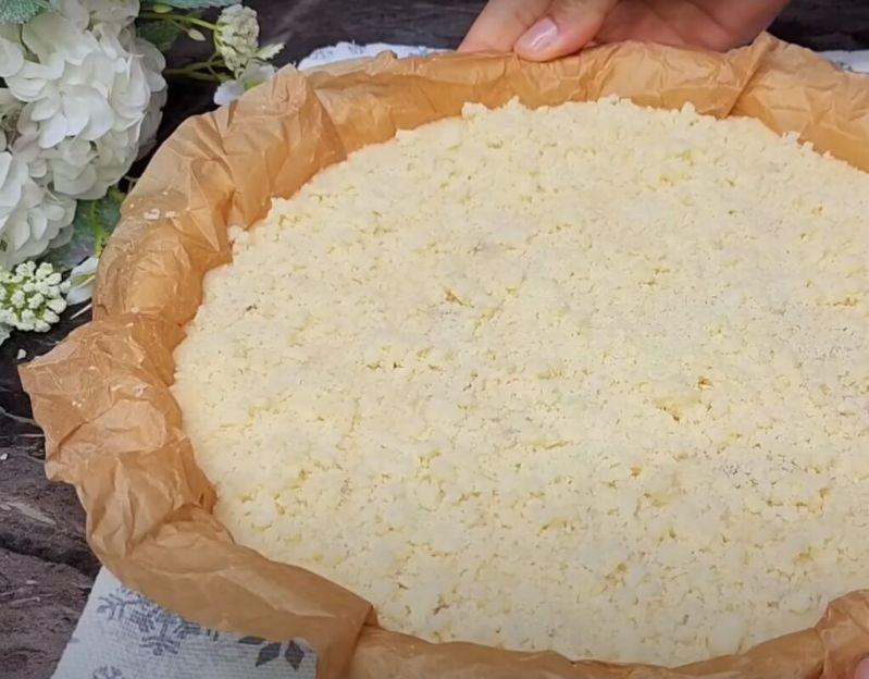 Застеляємо форму для випічки пергаментом, виливаємо тісто на поверхню, рівномірно розподіляємо по дну. Для скоринки в окремій тарі змішуємо вершкове масло з цукром і борошном, створюємо крихту.