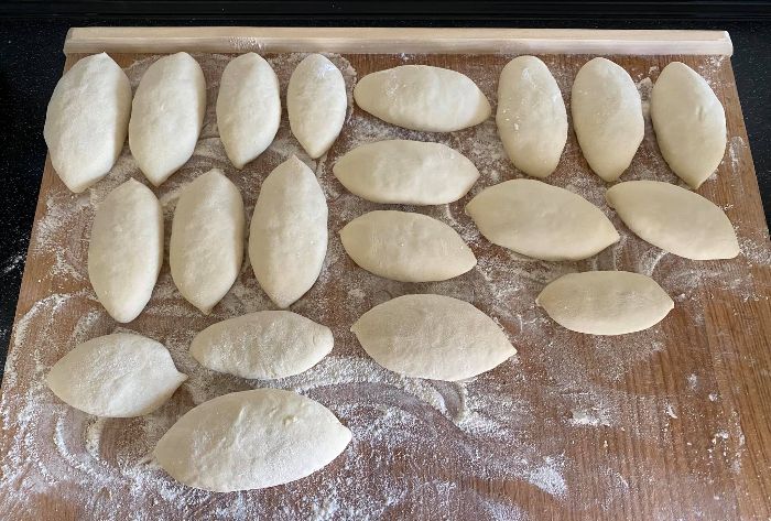 Далі я розділила тісто на 2 частини, одну тримала під рушником, іншу розкачала «ковбаскою», яку порізала на шматочки.