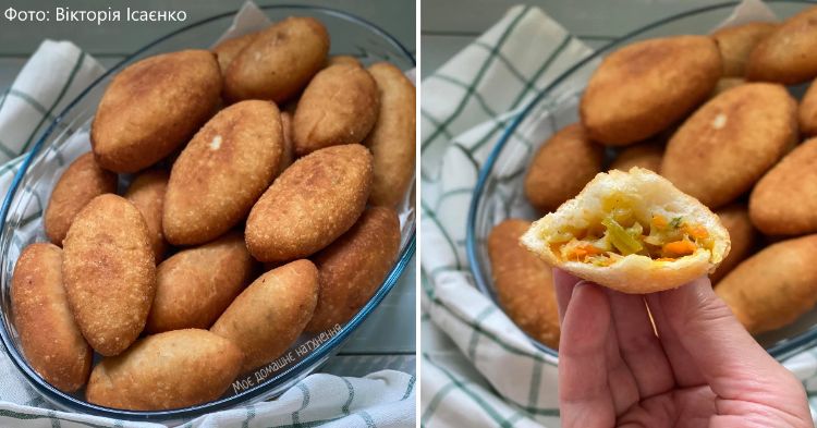 Коли залишилося десь 5 кульок, поставила сковорідку з олією на вогонь (олії досить багато, хоча б до середини пиріжка). В добре розігрітій олії смажите до зарум‘янення з двох боків на сильному вогні. Загалом у мене вийшло 20 пиріжків.