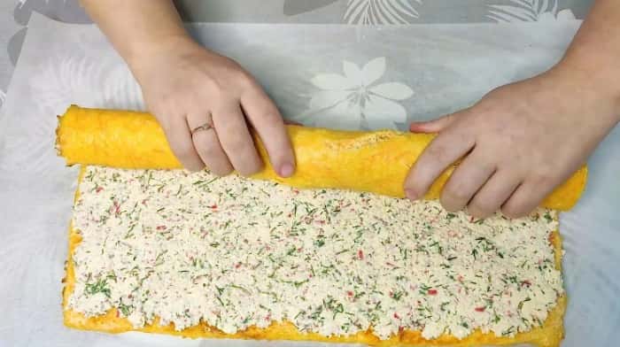 5️⃣ На охолоджену основу викладаємо начинку, розрівнюємо і згортаємо щільний рулет. Загортаємо у папір і ставимо в холодильник на 1 годину.