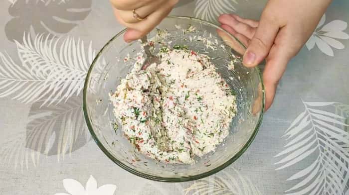 4️⃣ Готуємо начинку: натерті сирки змішуємо з подрібненими крабовими паличками, часником, кропом та сметаною.