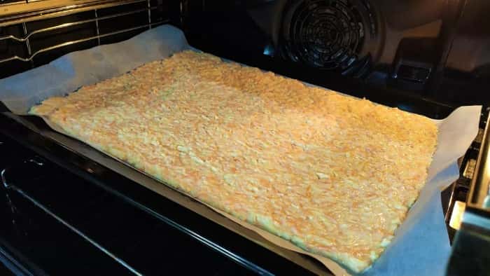 2️⃣ Форму застеляємо пергаментом, злегка змащуємо олією та рівномірно розподіляємо сирно-морквяну суміш.