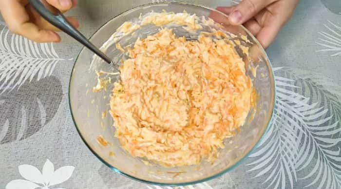1️⃣ У мисці збиваємо яйця з сіллю. Додаємо дрібно натерті моркву та твердий сир, кладемо сметану й перемішуємо до однорідної маси.