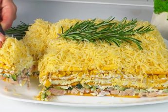 Салат виходить поживним завдяки яйцям, курячому філе та твердому сиру. Щоб філе було соковитим, після варіння залиште його остигати прямо в бульйоні — так м’ясо не стане сухим.