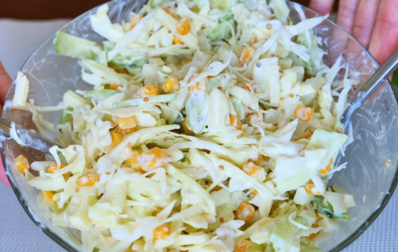 У салаті «Незабудка» капуста — головна героїня. Вона додає страві природної солодкості та хрусткості. Капусту доповнюють кисло-солодкі яблука, кукурудза та огірок, створюючи ідеальний баланс смаку.