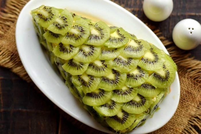 7. Очищене ківі наріжте тонкими слайсами і викладіть внахлист на сирну поверхню, покриваючи й боки салату. Надані руками форму акуратної ялинки.