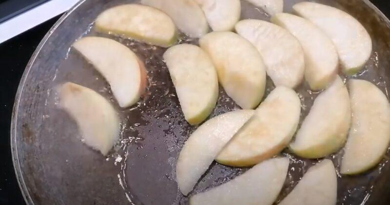 Далі в тій же сковороді з доданою олією обсмажити яблука з усіх боків до легкої м’якості. Поки яблука готуються, нарізати цибулю кільцями.